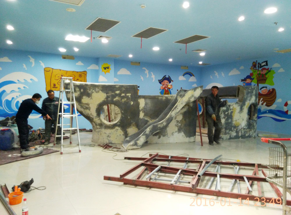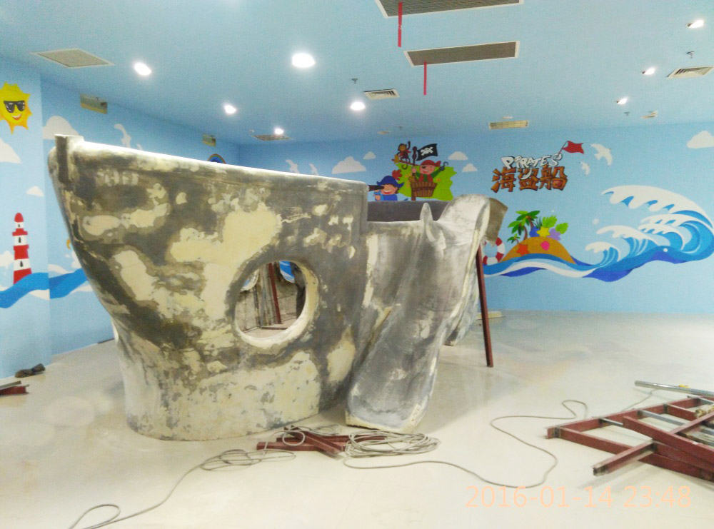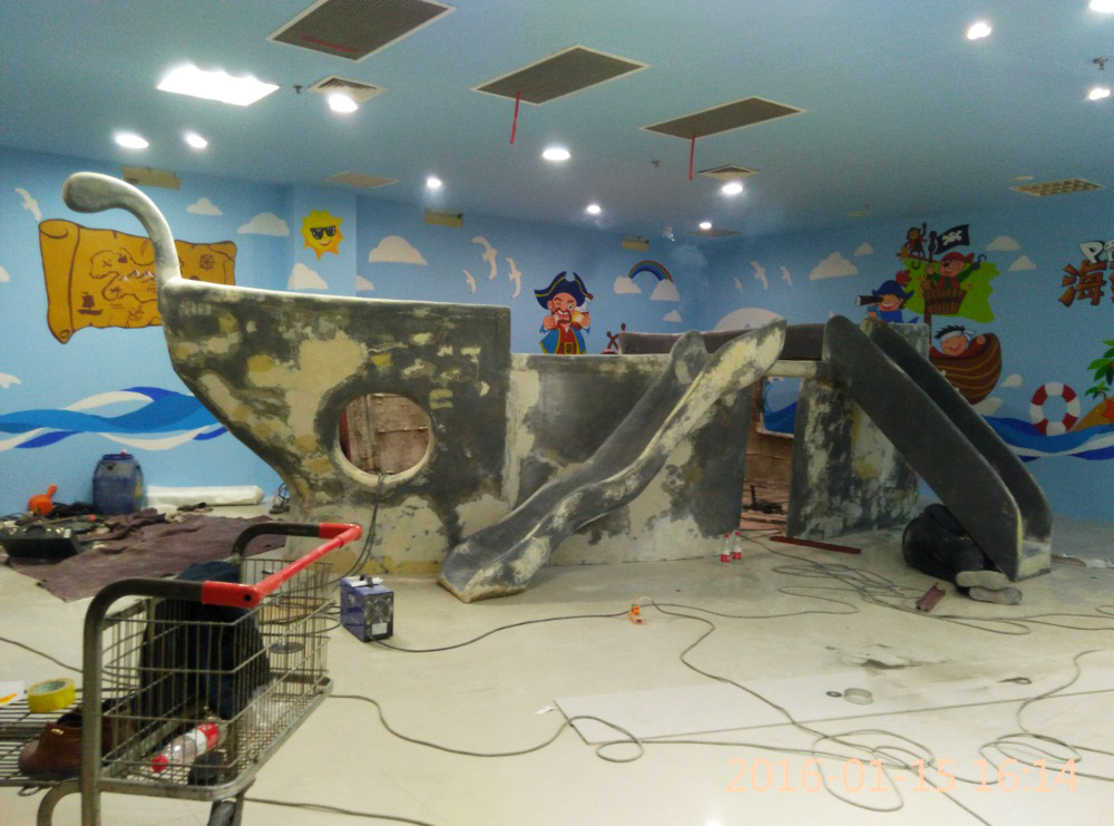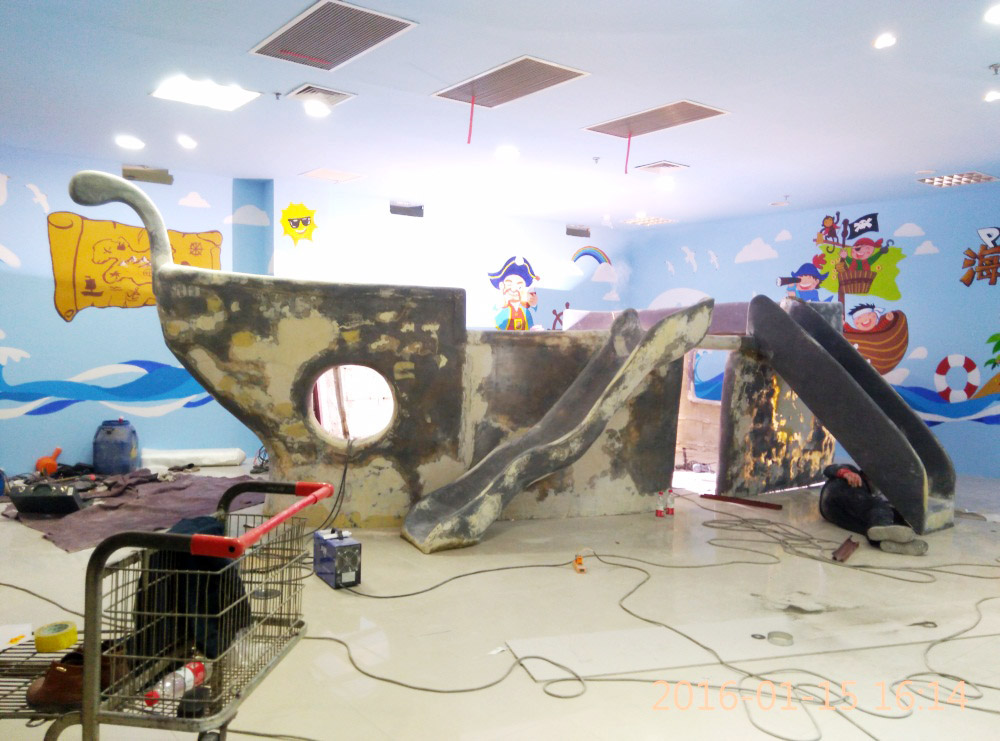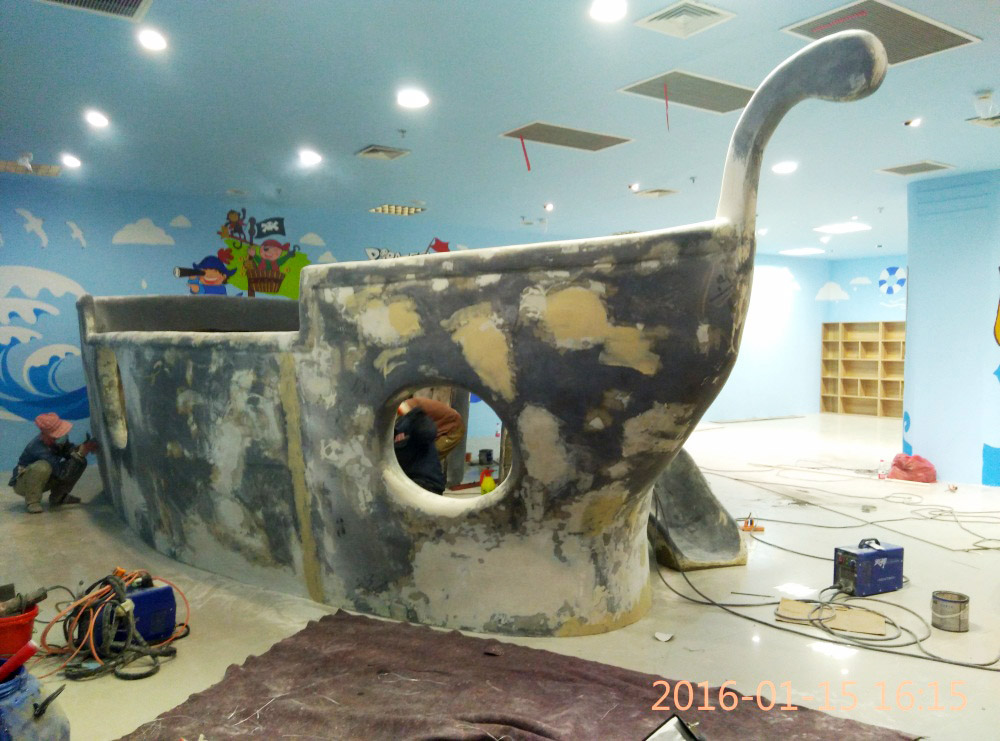 大型玻璃鋼游樂(lè)船雕塑竣工。2016年1月15-1月19日安裝于山東省濱州市黃河五路渤海十路銀座商城黃河店四樓。