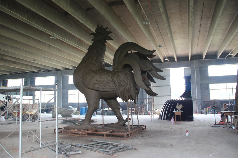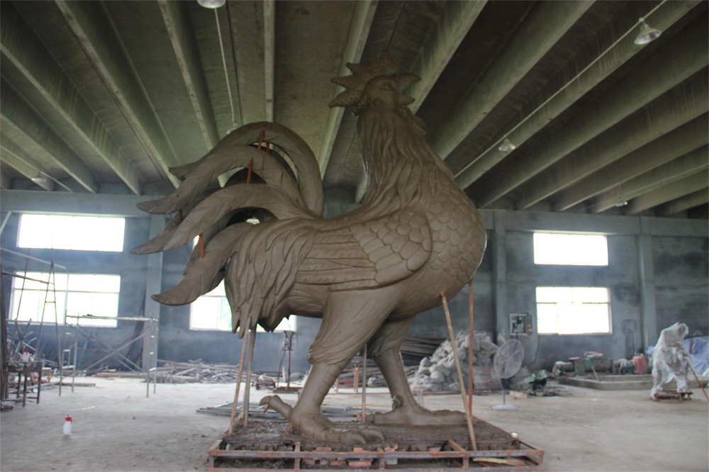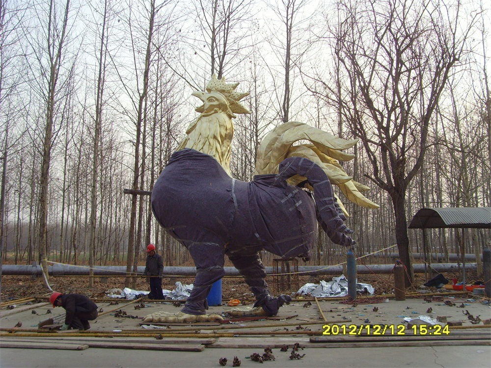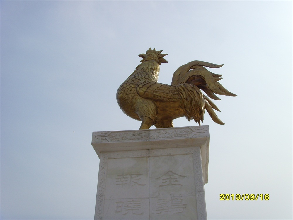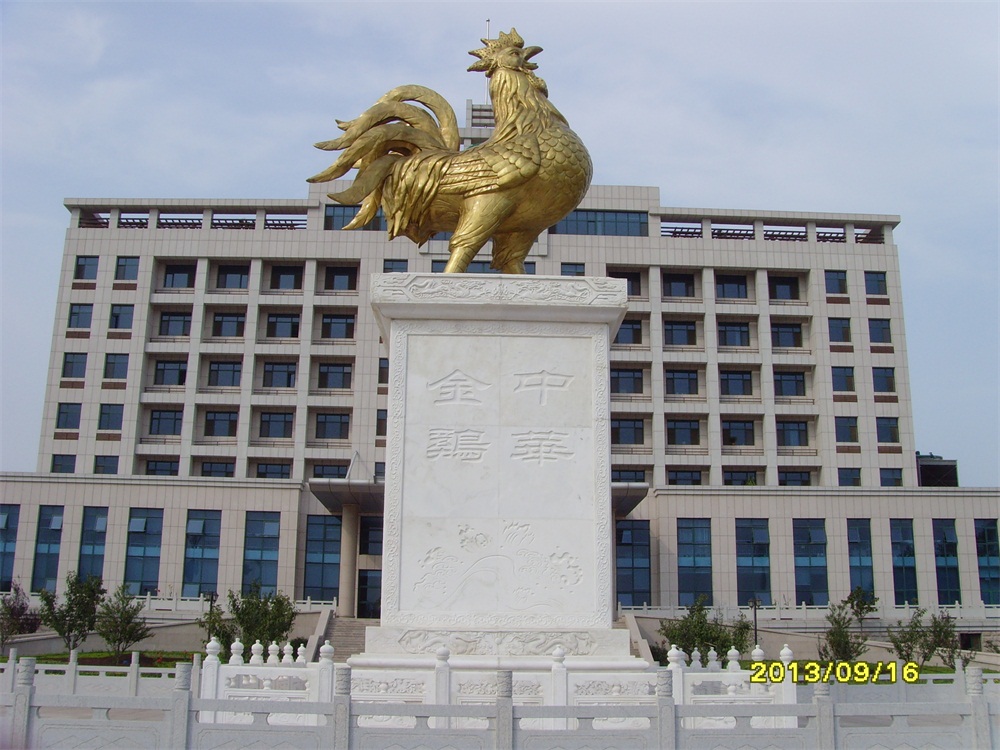 金雞雕塑高5米,為錫青銅鑄造,表面采用傳統(tǒng)的鎏金工藝全部鎏金,共用黃金6850克。為目前國(guó)內(nèi)最大的鑄銅鎏金雕塑。