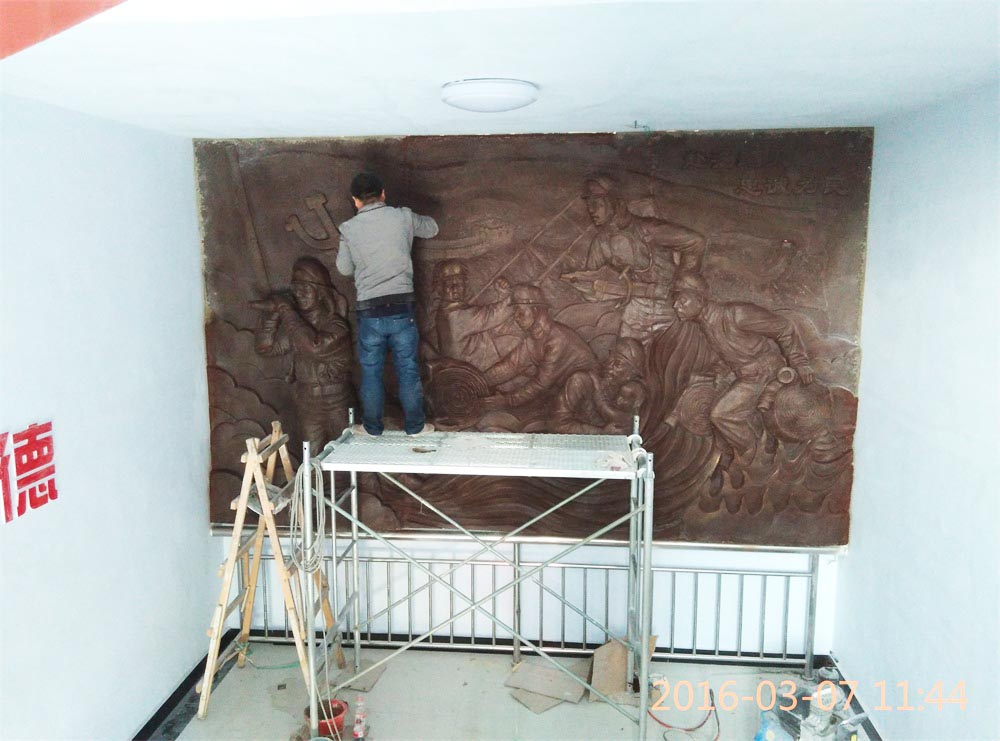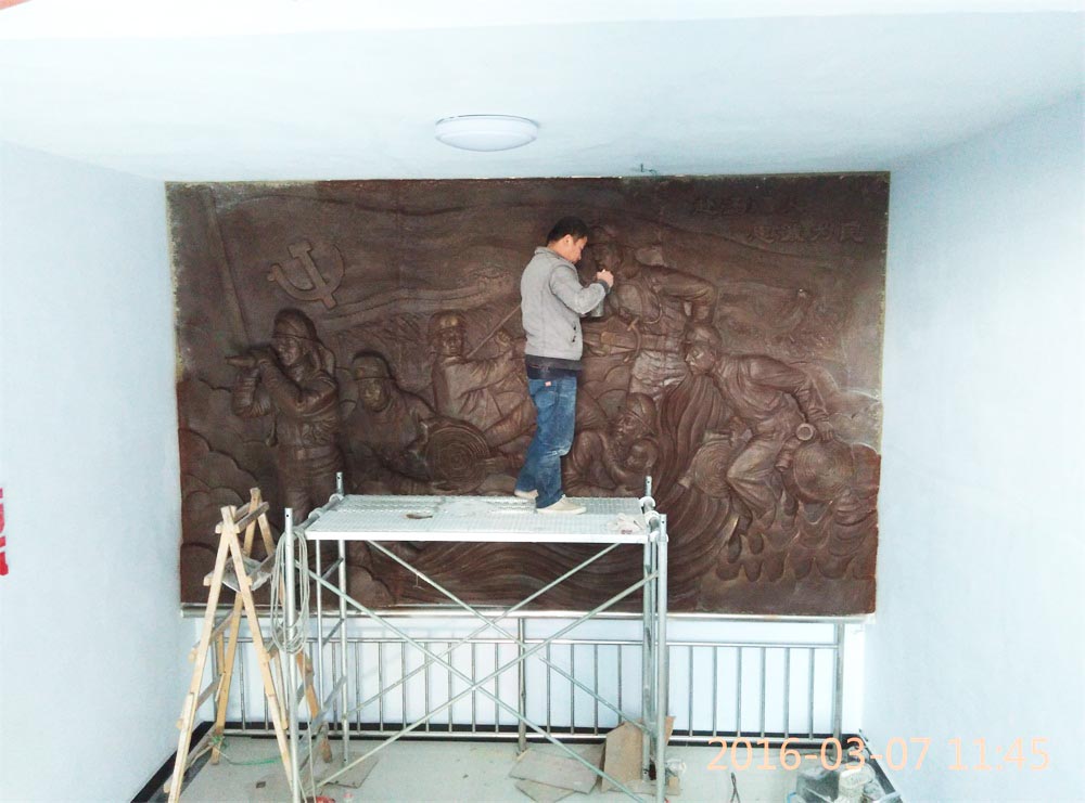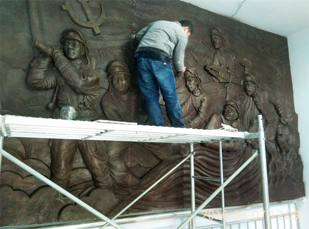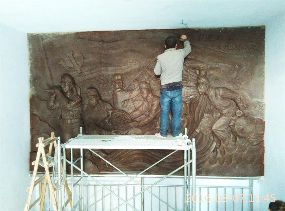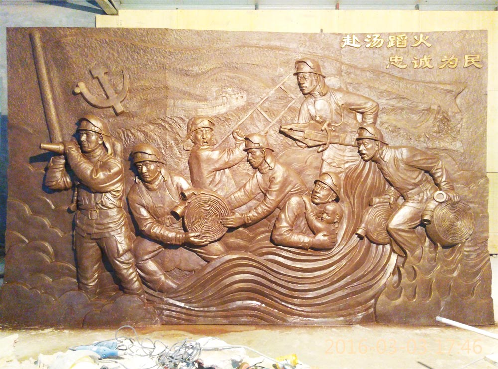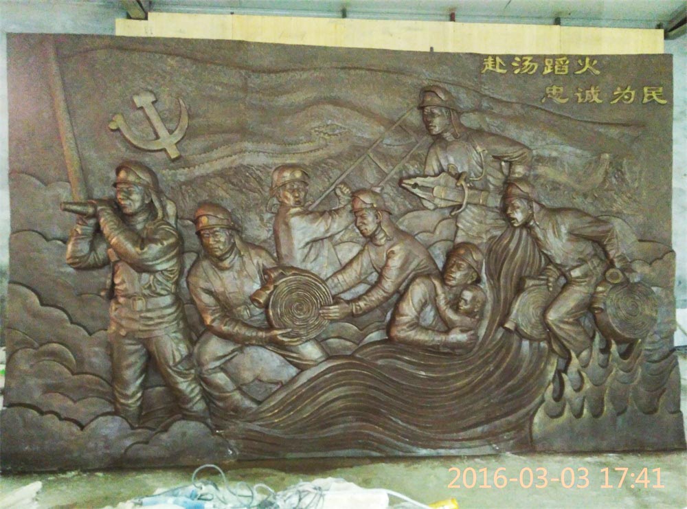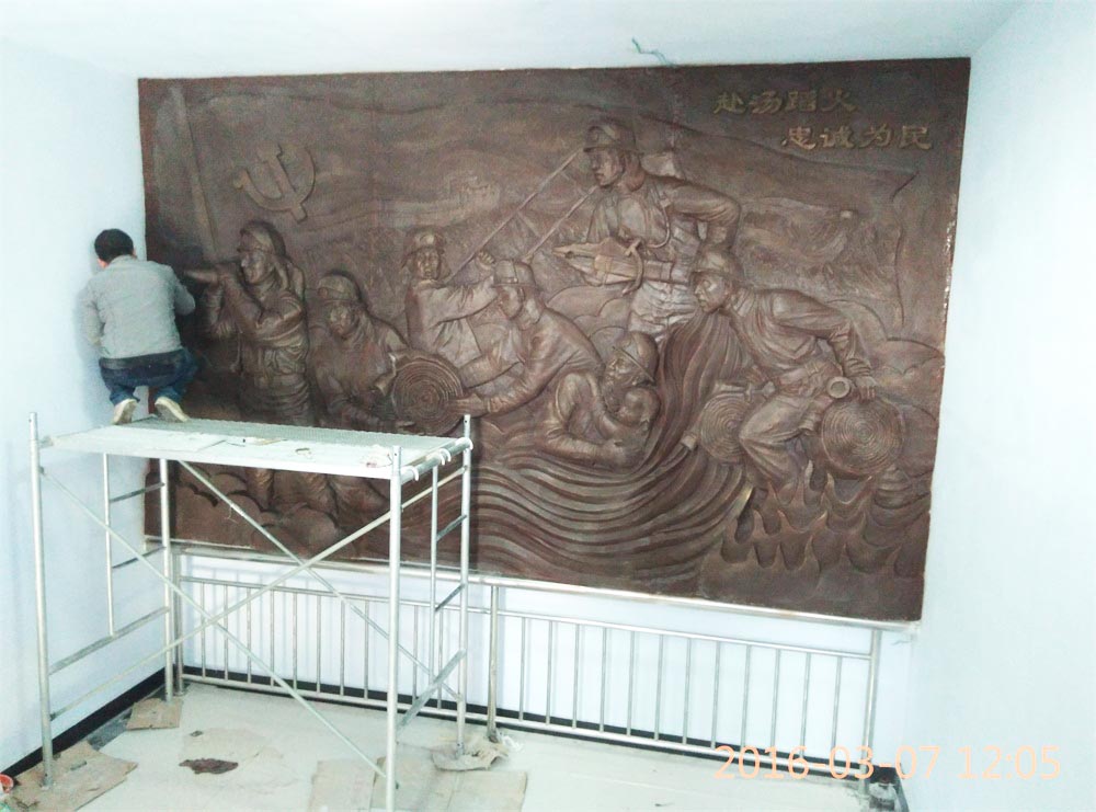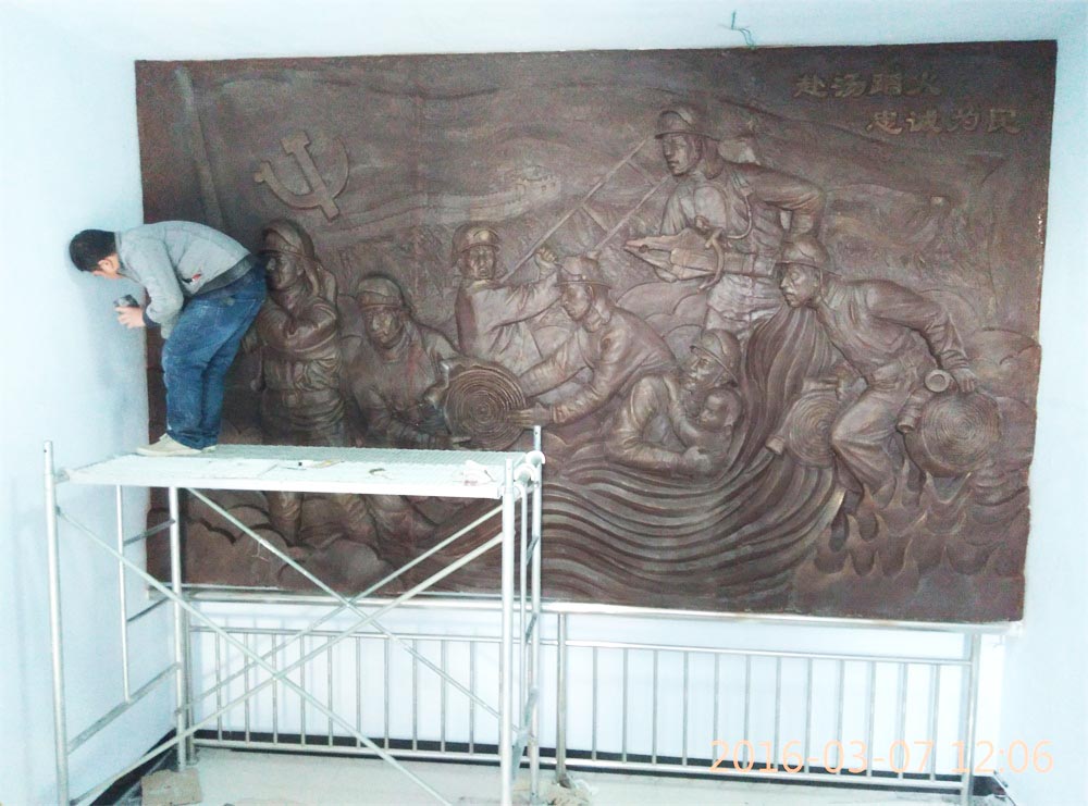 原創(chuàng)消防題材玻璃鋼浮雕,效果為仿銅色。