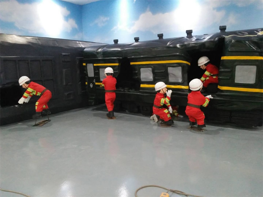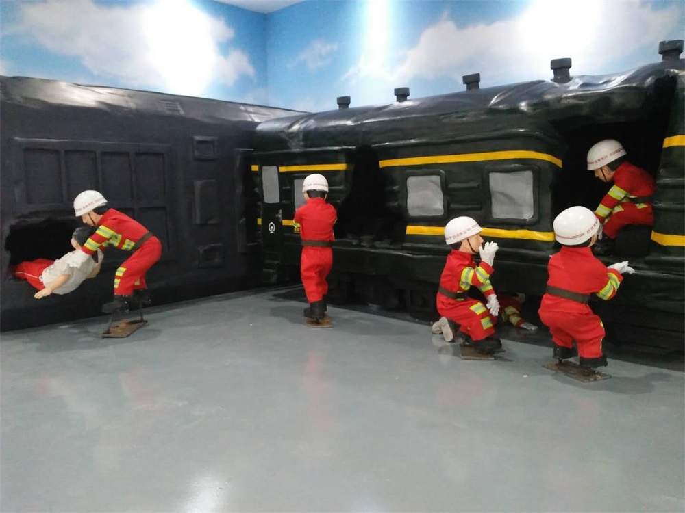 雕塑說(shuō)明:雕塑整體場(chǎng)景以發(fā)生在淄博市境內(nèi)的一場(chǎng)火車(chē)碰撞事故救援現(xiàn)場(chǎng)為題材?;疖?chē)模型采用泡沫雕塑工藝制作,表面彩繪。消防人物雕塑采用玻璃鋼雕塑工藝制作。