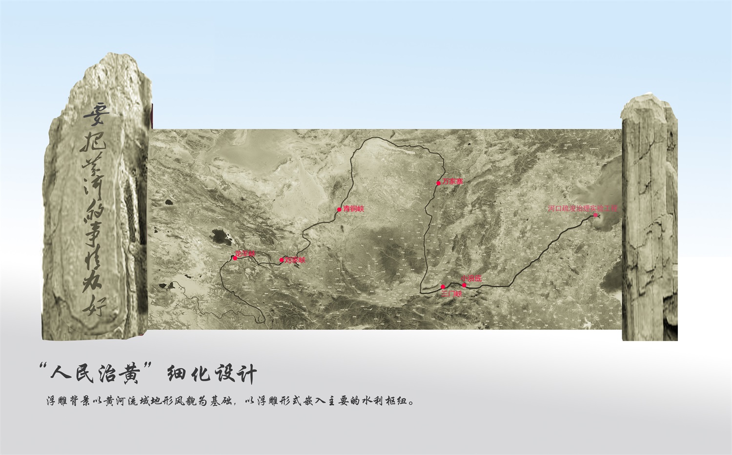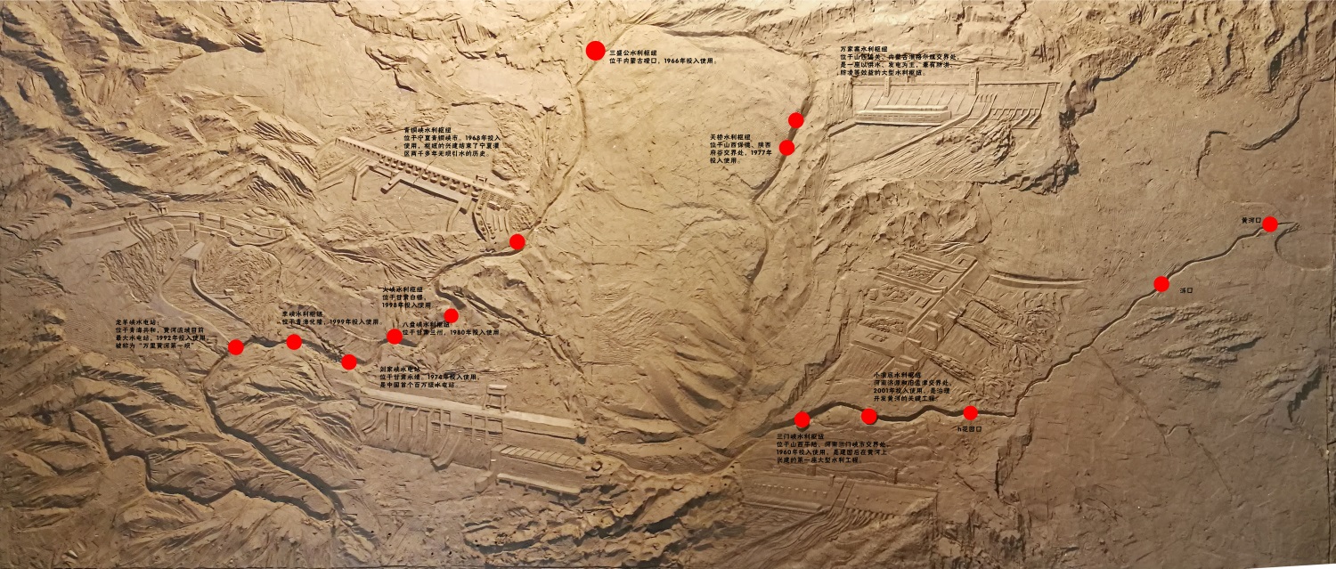 小浪底上游河段:按照地理位置將三門峽、龍羊峽、小浪底、萬家寨、劉家峽、青銅峽點綴其上(浮雕加簡介)。其余水利樞紐僅標注位置以及投入使用時間。